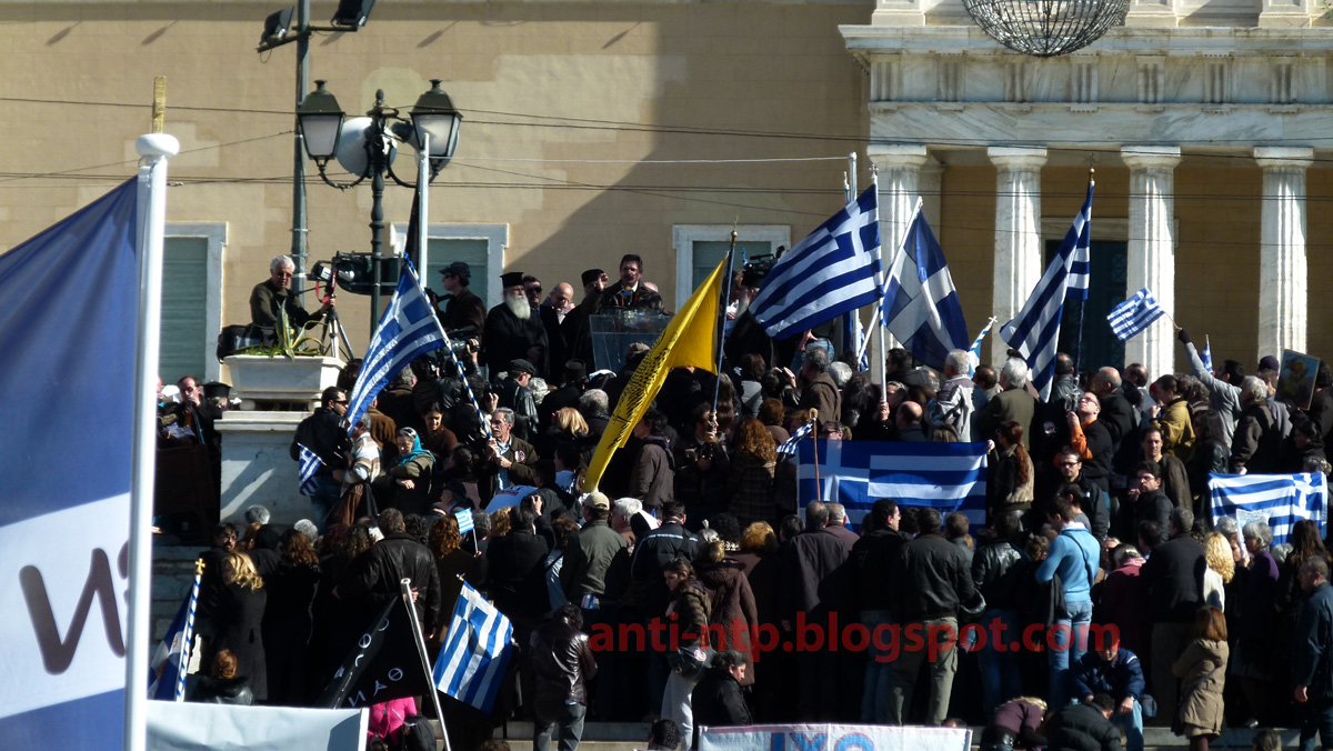 Από τους συνομιλητές συγκράτησα φυσικά τον π. Σαράντη, τον Ηγούμενο της Μονής Εσφιγμένου, τον ιδιαίτερα ξεσηκωτικό π. Νεκτάριο Μουλατσιώτη, κάποιους λαϊκούς και τελευταίο τον π. Ιωάννη Φωτόπουλο, μετά την μικρή ομιλία του οποίου, έκλεισε η διαμαρτυρία αυτή και ψάλλαμε την "Υπερμάχω" και τον Εθνικό μας Ύμνο. Ενδιάμεσα υπήρξαν και πολλοί άλλοι ομιλητές, που δυστυχώς δεν θυμάμαι ονομαστικά...